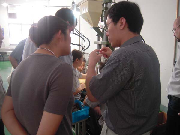 圖一:李總向德國(guó)客戶介紹產(chǎn)品注塑細(xì)節(jié)