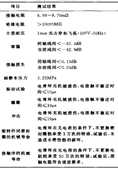 為保證導(dǎo)電滑環(huán)的水密性,在幾個(gè)會(huì)進(jìn)水的部位,都用“o”形圈進(jìn)行密封,在不需轉(zhuǎn)動(dòng)處采用一道“o”形圈,而在兩端法蘭與軸轉(zhuǎn)動(dòng)處及外殼與支架接觸的兩端,均采用兩道“o”形圈,從而保證做到能耐靜水壓5.25MPa,另外,還考慮在進(jìn)線處及出線處對(duì)電纜進(jìn)行特殊的密封處理,從而保證不會(huì)有海水滲人。該導(dǎo)電滑環(huán)裝置的測(cè)試結(jié)果如下表所示。